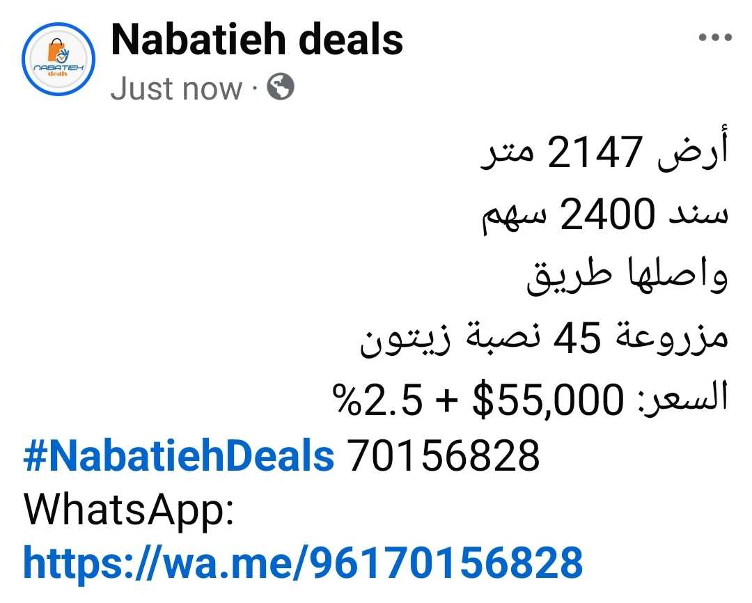 أرض 2147 متر سند 2400 سهم واصلها طريق مزروعة 45 نصبة زيتون السعر: 55,000$ + 2.5% #NabatiehDeals 70156828 WhatsApp: https://wa.me/96170156828.