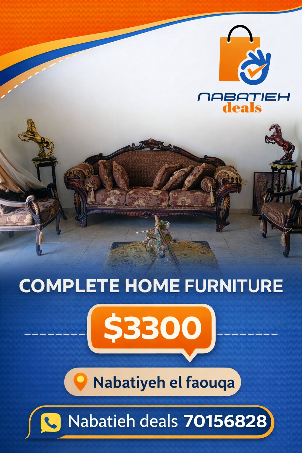 عفش بيت كامل فخم للبيع الحالة: شبه جديد المكان: قضاء #النبطية بلدة #النبطية_الفوقا السعر: 3,300$ #NabatiehDeals 70156828 WhatsApp: https://wa.me/96170156828.