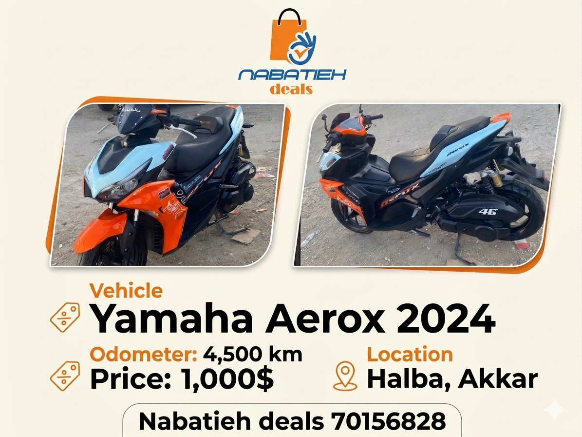 Yamaha Aerox 2024 ماشي فقط 4500 كيلو المكان: قضاء #عكار بلدة #حلبا السعر: 1000$ #NabatiehDeals 70156828 WhatsApp: https://wa.me/96170156828.