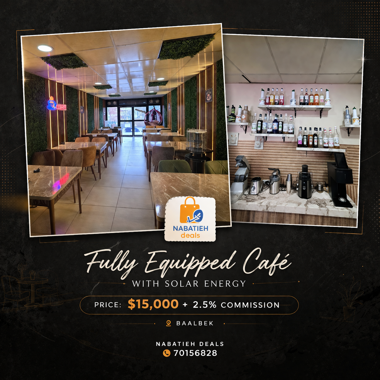 كافيه كاملة مع طاقة شمسية 16 لوح وبطارية ليثيوم وأنفرتر السعر: 15,000$ + 2.5% المكان: #بعلبك #NabatiehDeals 70156828 WhatsApp: https://wa.me/96170156828.
